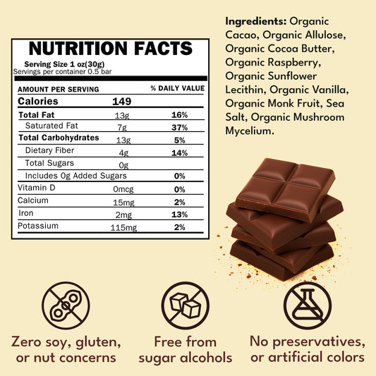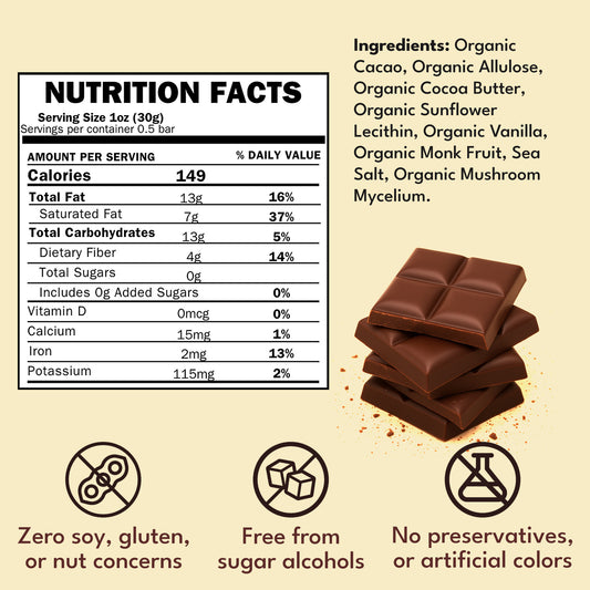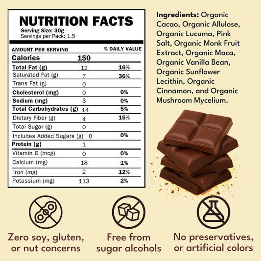 Macalat sweet dark chocolate bars are healthy chocolates designed for healthy lifestyles. These 8-piece breakup bars are USDA Organic, allergen free and non-GMO. All ingredients are plant-based and well suited for vegan and keto diets. Enjoy fine flavor Peruvian cacao that is sweetened, sugar free, using the natural ingredients allulose and monk fruit. A magical cordyceps extract mitigates the bitterness typical of 70% cacao. The Essence bar defines the proprietary chocolate that is the foundation upon which all other Macalat products are built.