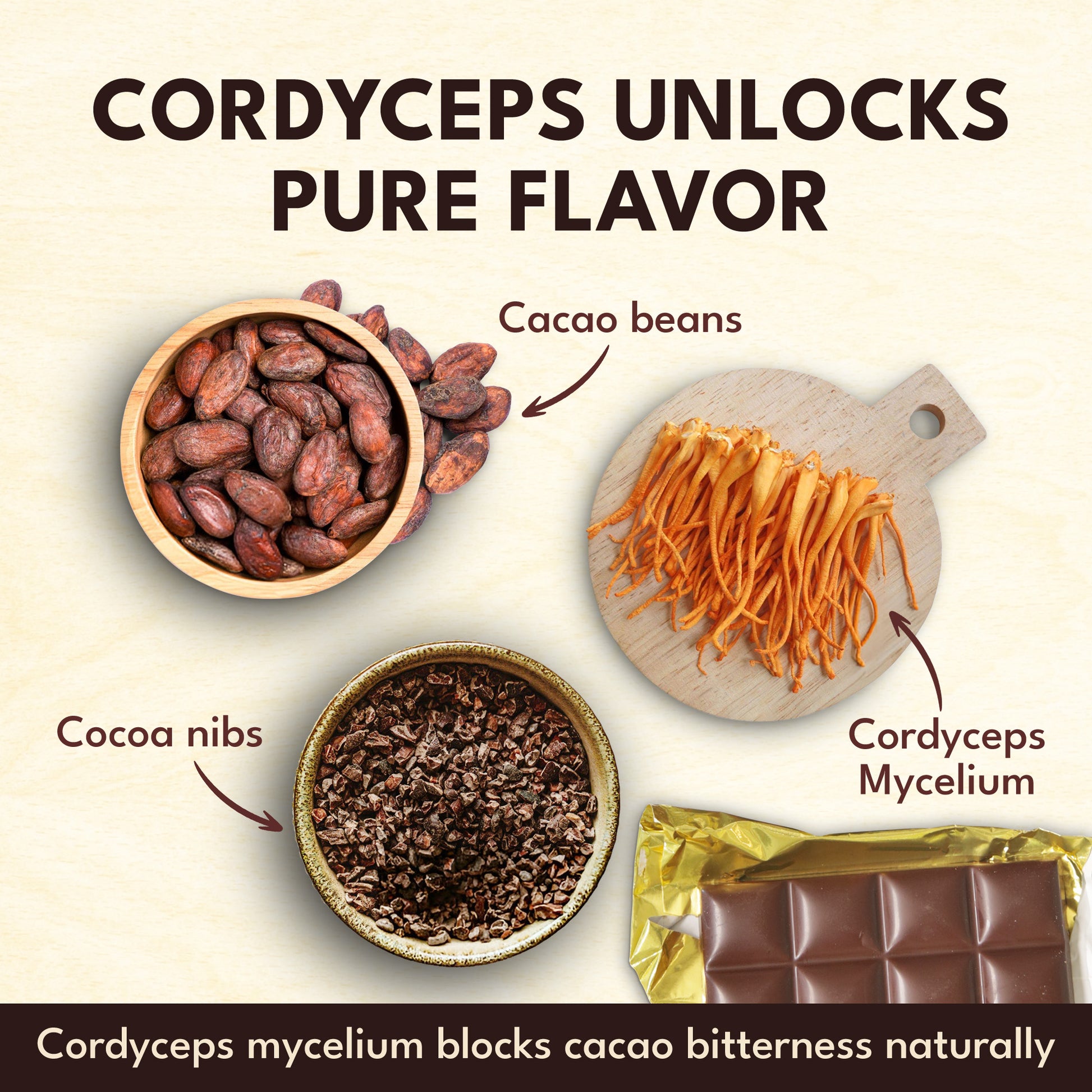 Cordyceps Mycelia: Fermented mushroom enzyme enables one to enjoy the benefits of 70% cacao bittersweet dark chocolate - bitter-free
