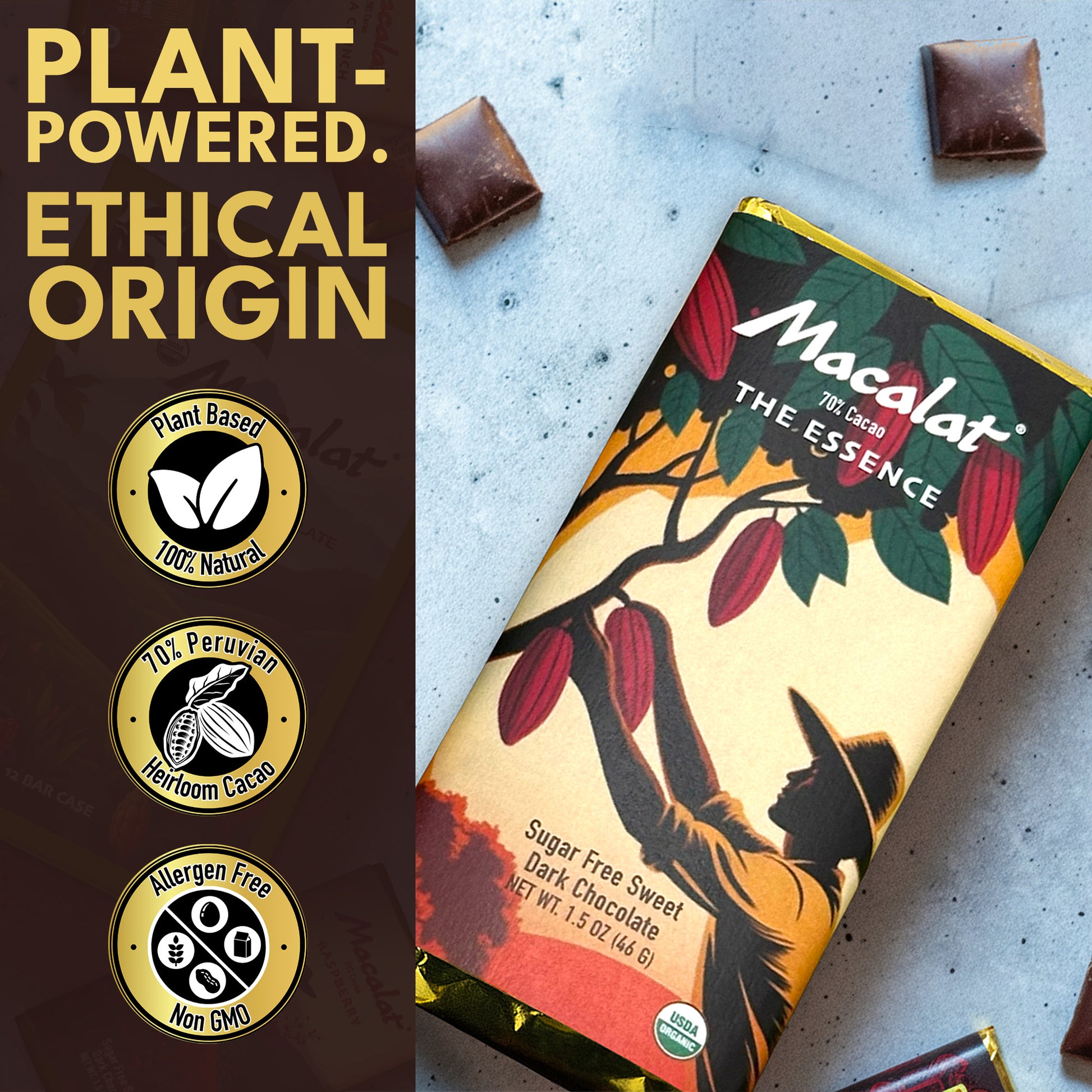 Discover Macalat The Essence Bar - the bold sophistication of healthy dark chocolate that is plant based, allergen free and non-GMO.